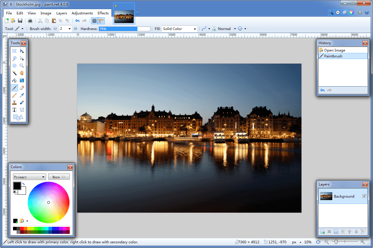 Paint.NET is a lightweight, high-powered and 100% FREE Photo Editor. It supports layer, stamp clone, edge detection, motion blur, history, effects and other practical tools. But it does not support the PSD file format. In addition, this program requires to install the Microsoft .NET Framework.