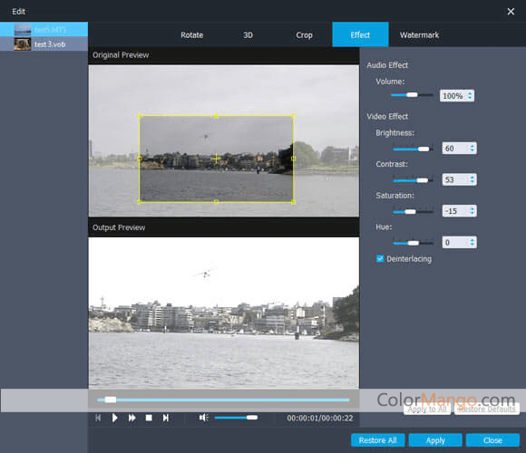 Video Editing Video effect: Set brightness, contrast, saturation, audio, and hue to adjust the output video effect. Video clip: Split the source video into multiple clips. Video crop: Remove the black border around the video and customize the video playback area's size. Add watermark: add text or image watermark to the source file to personalized output video. Video merge: Create an entire file by concatenating multiple single video clips or video and audio files. Video rotation: Rotate and flip the video to the correct angle.