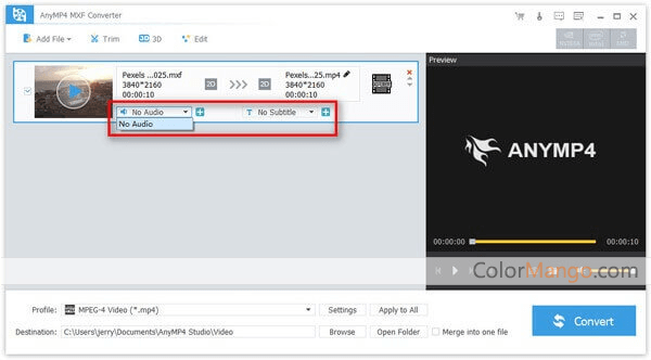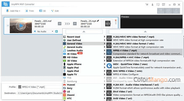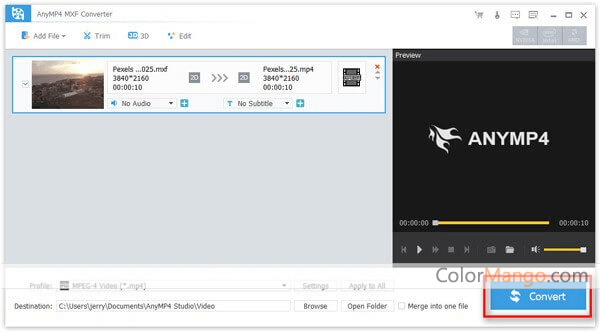 AnyMP4 MXF Converter Features * Convert MXF into 3d video. * Support MXF160 format * Merge multiple MXF files or split the video. * Use AMD and NVIDIA®CUDA™ technology to make the conversion speed faster. * Support multiple media libraries, Sony Las Vegas, Adobe Premiere, Windows Movie Maker, etc.