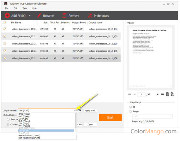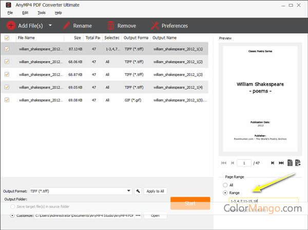 Take a Closer Look at AnyMP4 PDF Converter Ultimate: 1. Convert PDF files to editable documents like Text, Word, Excel, PowerPoint, ePub, and HTML. 2. Convert PDF files to images like JPG, PNG, GIF, TIFF, and more, and also, users are capable of defining its size, color, and other settings. 3. Built-in advanced OCR technology to enhance recognition accuracy and stability, and to export files in different languages. 4. Batch conversion and in superior speed 5. Exports selected page ranges, or current page, or the whole PDF.