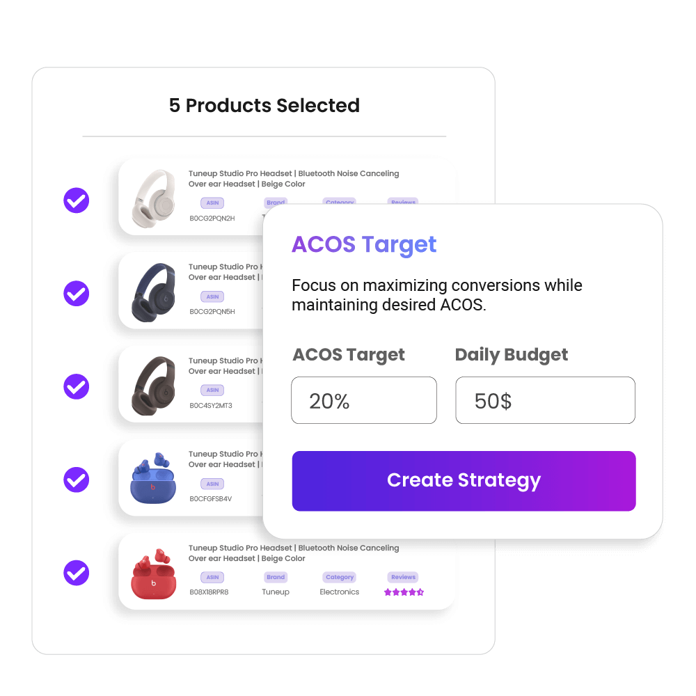 Predictive analytics and strategy modes (ACoS target, budget target, constant bid) built on machine-learning.