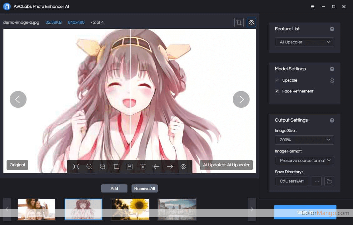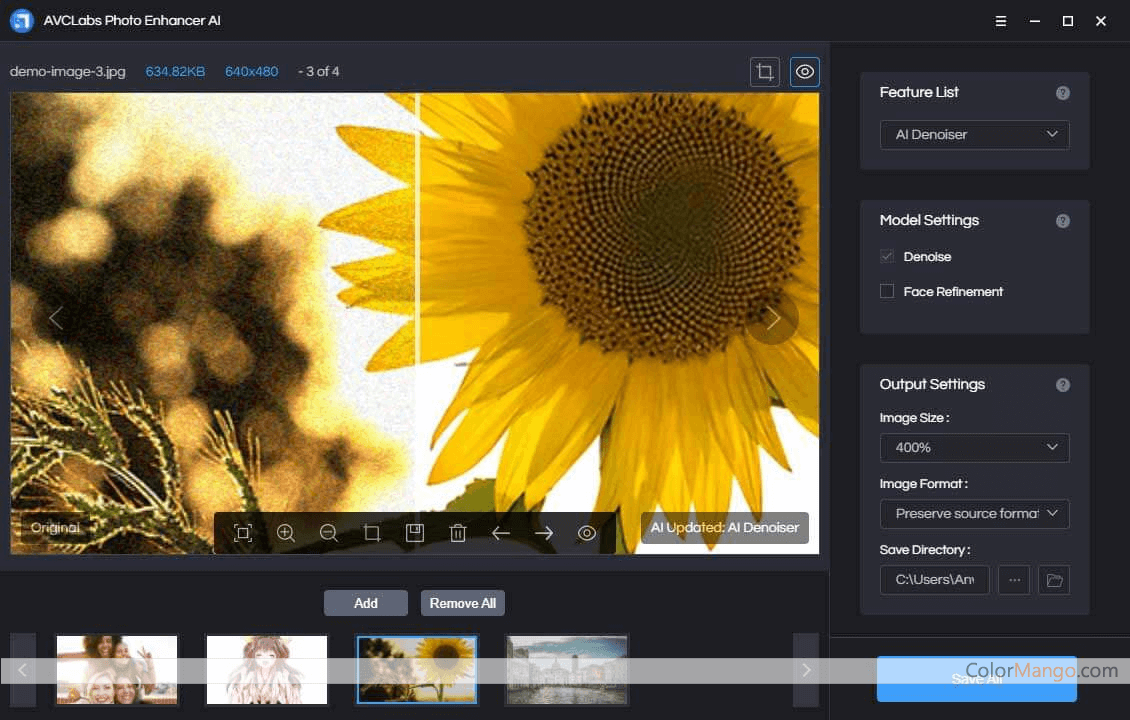 AVCLabas Photo Enhancer AI provides a fast and easy way to enhance the quality of your photos. It applies artificial intelligence technology and uses AI models to process photos. It can reduce digital noise, correct bad colors, white balance, and sharpness, fix blurry images and denoise photos. This photo enhancer AI program restores definition often lost through the digital imaging process. It can help you achieve natural color reproduction, high detail, and high-quality photos.