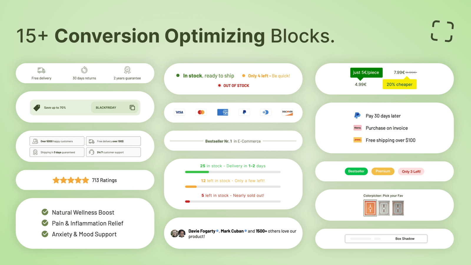 ✅ Add low-stock counters, benefit lists, trust badges & more ⚙️ Fully customizable blocks via Shopify Theme Editor 🚀 Lightning-fast performance, zero impact on page speed 🧩 Works with all 2.0 themes, no dev needed 💬 Multilingual support (EN, FR, DE) + responsive live chat