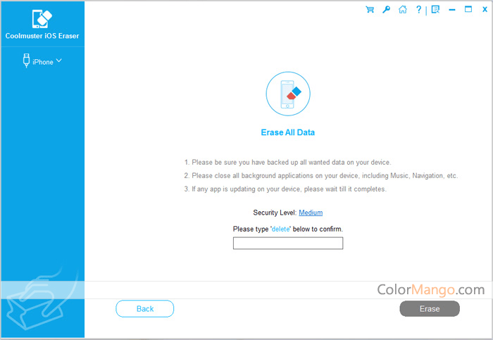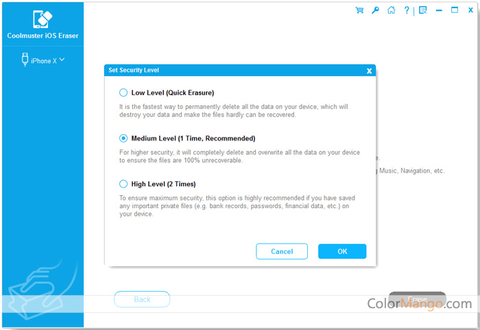 Take A Closer Look at Coolmuster iOS Eraser: owing to the advanced data scanning and detecting technology, Coolmuster iOS Eraser provides three erasing levels: 1. The low level only erases your ordinary data quickly to save your time. 2. The medium level will delete all traceable data wreckages and rewrite all existing and deleted data space to ensure no traceability remains. 3. The high level is the safest option to overwrites all your data twice so that it couldn't have any possibility to recover.