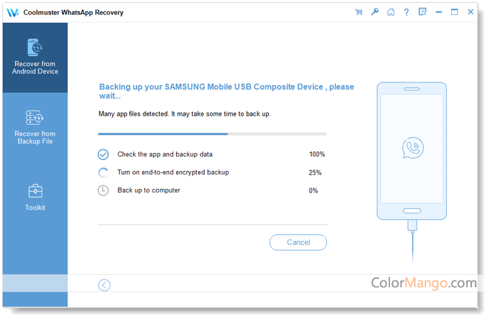 Coolmuster WhatsApp Recovery is a software program designed to recover deleted or lost WhatsApp data from Android devices. WhatsApp is a popular messaging app that allows users to send text messages, voice messages, photos, videos, and other types of media. Coolmuster WhatsApp Recovery can retrieve WhatsApp messages, contacts, photos, videos, and other attachments that have been deleted, lost, or accidentally erased from an Android phone or tablet. This software uses advanced scanning algorithms to scan the device and recover the lost data, which can then be saved to a computer or other storage device. Coolmuster WhatsApp Recovery may be useful for users who have lost important WhatsApp data due to accidental deletion, device damage, software crashes, or other reasons.