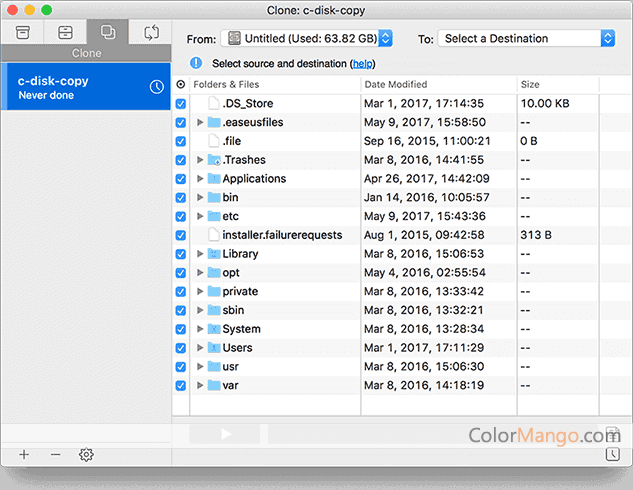 EaseUS Todo Backup for Mac software features List scheduled and archived backups, which can be compressed to save disk space Create backup tasks on selected files, folders, applications, and system data Clone the source disk and all saved data to the target disk Select the file or folder to synchronize, and then select one-way or two-way synchronization mode
