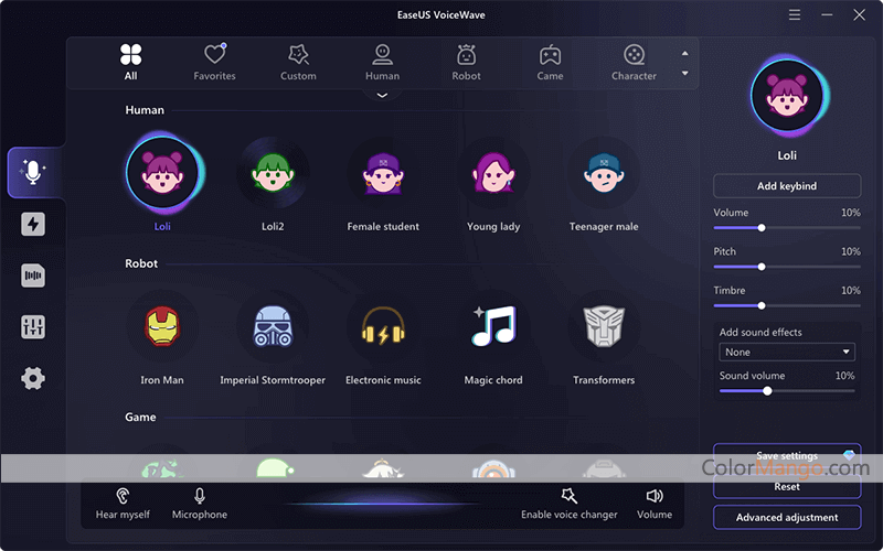 EaseUS VoiceWave is an AI real-time voice changing tool software that can change the voice of its users. It is suitable for various gaming, live streaming, video, and online chat tools and platforms such as Discord, Twitch, Roblox, Minecraft, Zoom, Skype, YouTube, and more. It can change the pitch, frequency, volume, and timbre of the human voice, making users sound like a male, female, elderly person, or child. The software product has various sound effect modes, such as robot, alien, demon, animal, cartoon, anime, celebrity, and movie/TV characters. Users can freely choose their preferred sound effect mode and apply it to their voice in real-time.