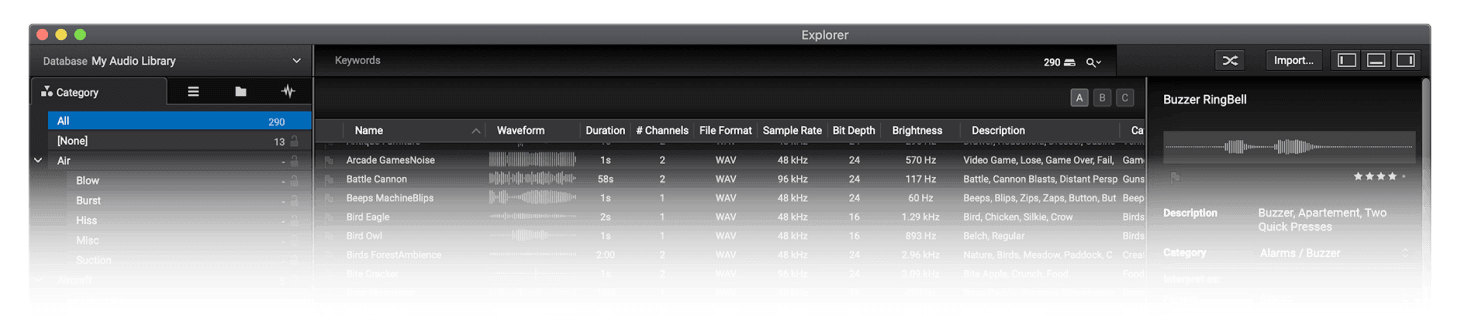 Explorer is a powerful application that allows you to manage your files. Built to support surround and immersive formats, it offers exceptional control. With the optional Explorer SFX Cloud subscription, gain access to over 100,000 professional sound effects.