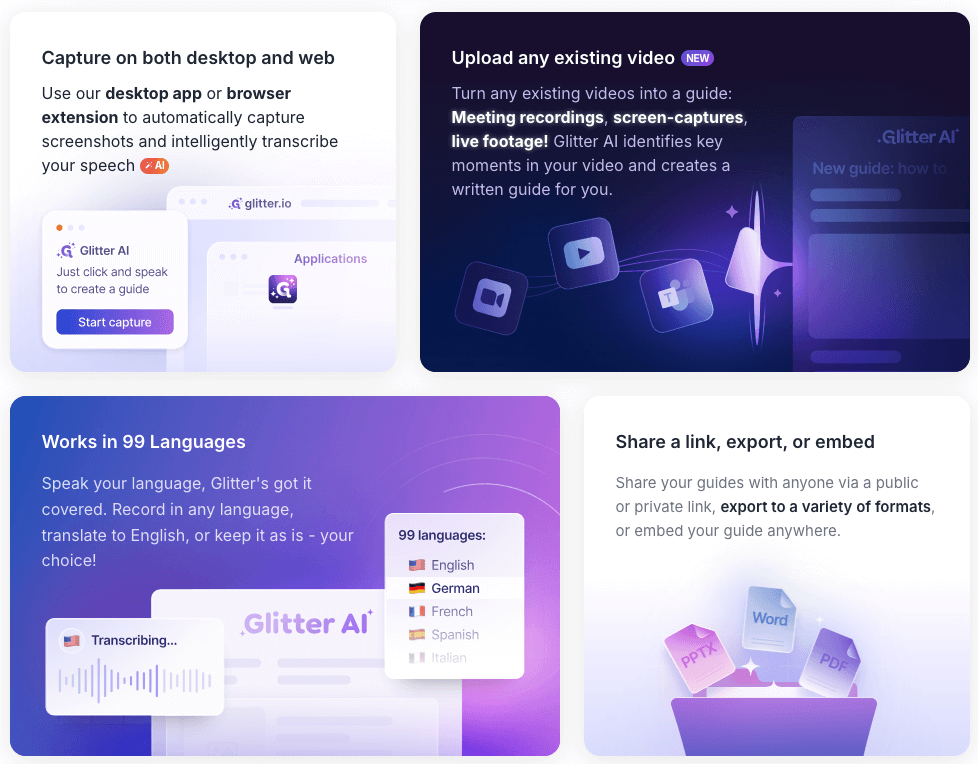 AI-powered tool that auto-turns recordings into step-by-step guides, with screenshots, transcripts & multi-language support.