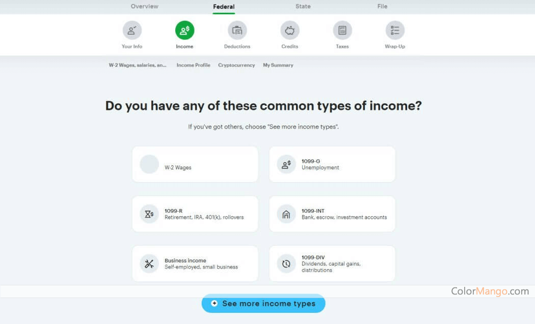 H&R Block's online tax filing software is straightforward to use. It can import the tax forms declared by other tax filing software in the previous year and supports uploading W2 documents by taking photos, importing W2 and 1099 through the database of the partner institution, or importing income and expenditure data through other accounting software. H&R Block also has a Mobile App.