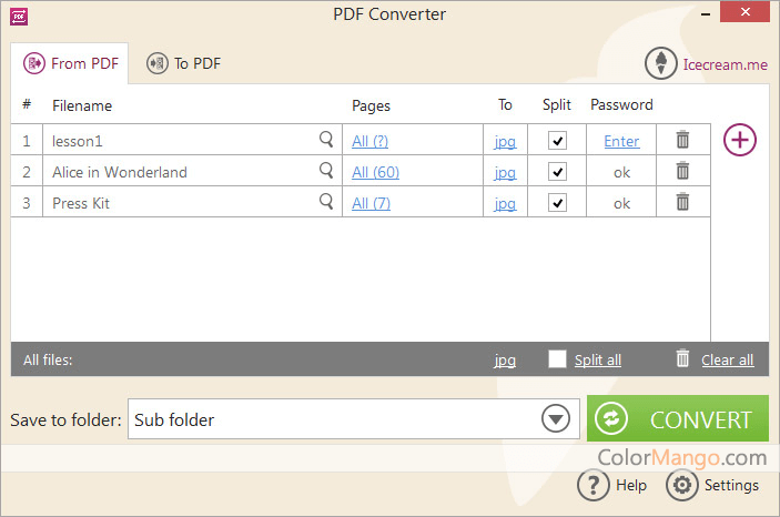 Icecream PDF Converter Pro is a specialized converter software. It can convert documents, images, ebooks to PDF; merge several documents into one PDF file; and convert PDF to other formats, including JPG, PNG, BMP, TIFF, etc.