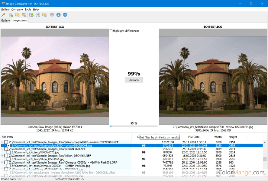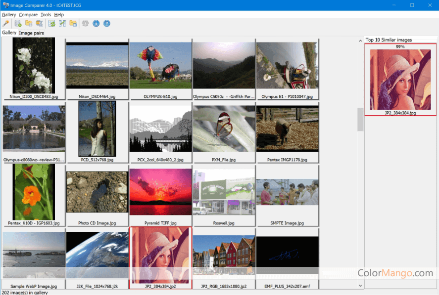 If the image has a different resolution or color range, it will not be a problem. Image Comparer can find all similar images, even if one of them is in JPEG format, and the other is in standard windows bitmap format. Support: JPEG, J2K, BMP, GIF, PCX, PNG, TIFF, TGA, ICO, CUR.