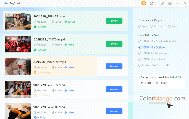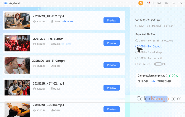 *Supports popular video formats like MP4, MOV, AVI, etc. *Watermark-Free Compression *Storage Space Saving *Multi-End Use: Compressed videos on both your phone and computer. *Group Compression: Support compressing multiple files at once, increasing compression speed. *Customizable Compression: Customize compression settings for single or multiple files. *Size Customization: Allows you to input the expected size for compression according to your needs. *Compatibility: Compressed videos can be easily shared on platforms like Discord, WhatsApp, Vimeo, YouTube, Facebook Messenger, Gmail, Outlook, and more. *Quality Preservation: Ensures that the high resolution of the video is maintained after compression.