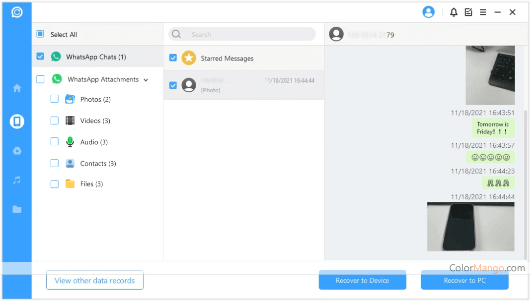 iMyFone ChatsBack for WhatsAPP Recovery Support the recovery of WhatsApp and WhatsApp Business data lost by iPhone and Android phones. Support to recover WhatsApp data from iTunes backup files and Google Drive backup files and restore it to your iPhone or Android device. Support retrieval of various WhatsApp data formats, including conversation records, pictures, movies, voice, contact information, documents, etc. You can view WhatsApp data before restoring it. Then, select the data that needs to be saved and restore it to your iOS/Android phone or computer.