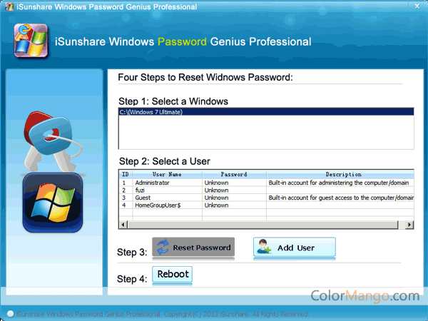 iSunshare Password Genius has built-in four powerful password attack modes and multi-core CPU acceleration technology so that it has solid insurance for decoding efficiency. Also, it has many features like a straightforward interface that doesn't require any password recovery experience; the Save and resume function allows users to save and continue the process state at any time. iSunshare Password Genius has four different versions: Standard, Professional, Advanced, and Raid. The distinction between them is the Windows version they support. So, for instance, if you would like to recover local or domain passwords on Windows 8, advance version is more suitable. And the standard version is for recovering local passwords on Windows 7.