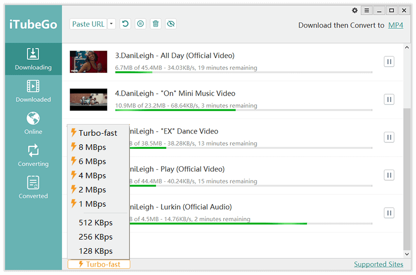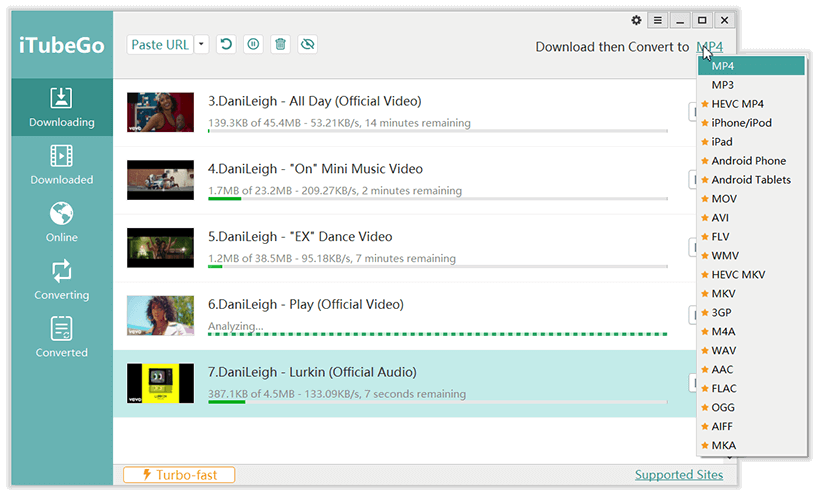 iTubeGo YouTube Downloader has a built-in video converter that converts audio and video to high-definition 1080p / 4K MP4, 320kbps MP3 formats.