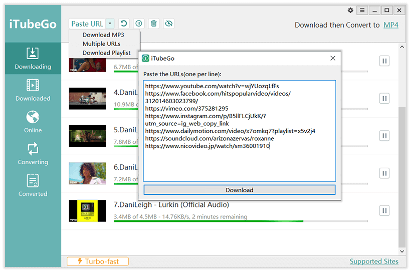 iTubeGo YouTube Downloader can download video and audio from video/music sites like YouTube, Facebook, Dailymotion, Instagram, Vimeo, SoundCloud, etc. Just copy and paste the YouTube address and download it automatically. It's so easy!