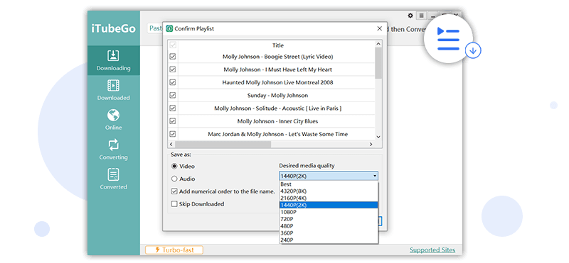 iTubeGo YouTube Downloader features: - Download HD / 4K video and audio from more than 1000 video/music sites; - Download YouTube playlist; - Convert video and audio to high-definition MP4, 320kbps MP3 format; - Download audio and video files in bulk. Support multi-task download, save your time.