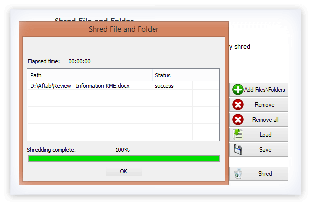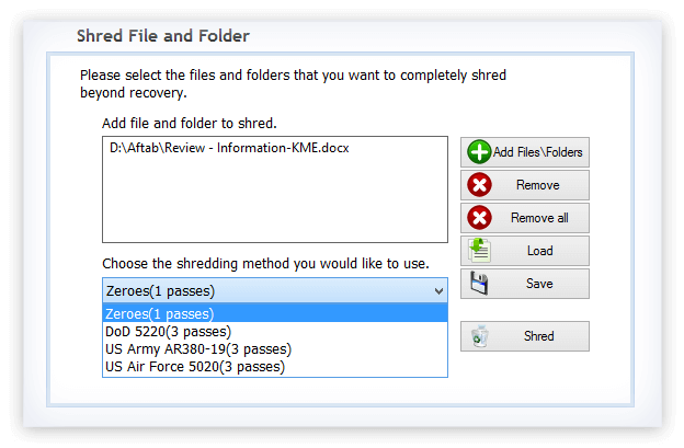 Additional Features *Create Scheduled File Shredding Task. *Automatic Files Shredding. *Include Advanced File Shredding Options like Shred File and Folder, Recycle Bin, System Files, Free Disk Space, and Useless Files. *Set the Default Shredding Algorithm from Zeroes (1 Pass) to complex Peter Gutmann (35 Passes). *Rename the Files) or Folders before shredding. *Save Shredding History.