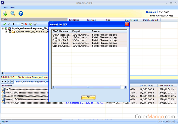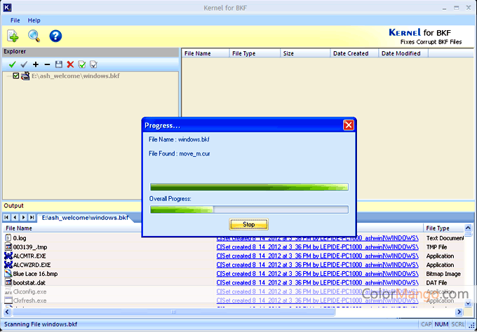 Kernel for BKF Repair function 1. Repair BKF file damaged due to cyclic redundancy check (CRC) error. 2. Easy to operate user interface. 3. Intelligent algorithm for repairing damaged files. 4. Smooth recovery of damaged files created by NT backup and HT Data Protector, 5. Effectively recover UNICODE characters. 6. Support different types of backup files BKF, CTF, and FD for data recovery.