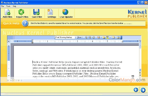 • I failed to access my Microsoft Publisher files. Kernel Recovery for Publisher repaired all the damaged Publisher files perfectly. I’m very happy to find it.
