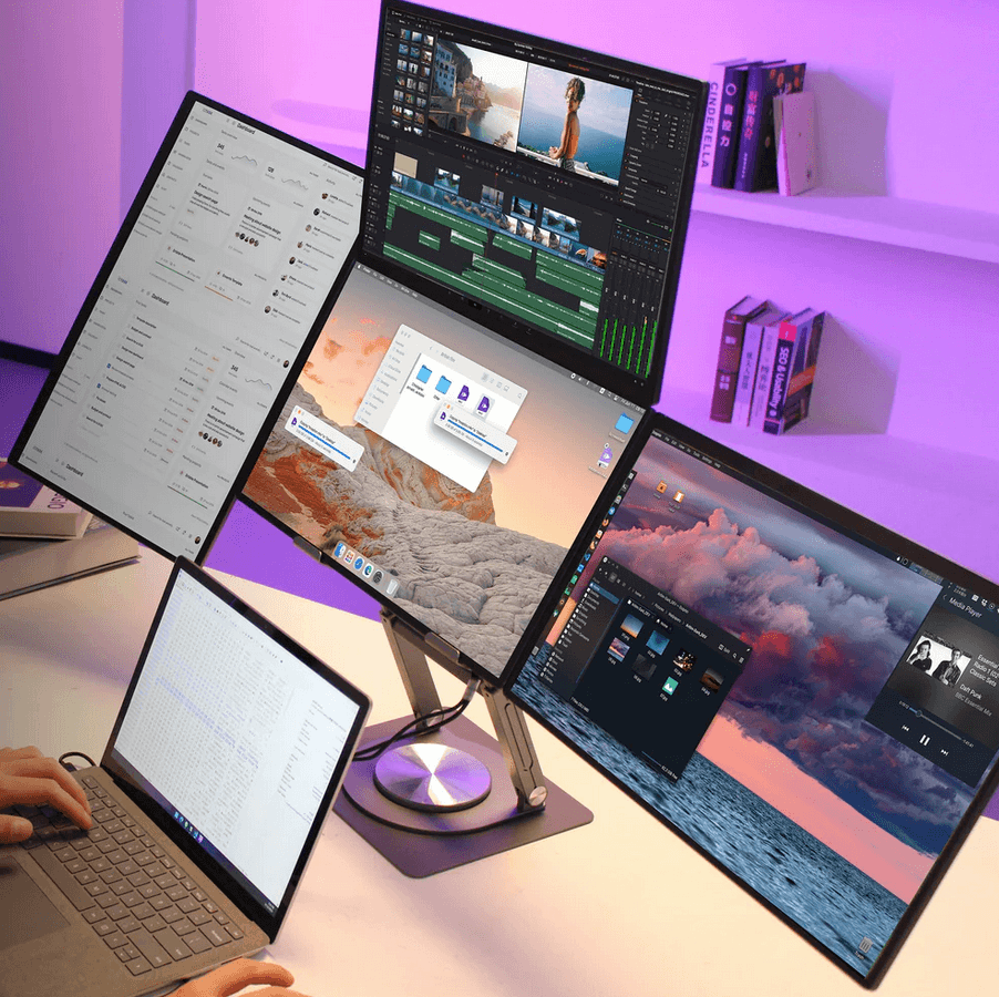 Portable multi-screen monitors and accessories for mobile productivity setups.