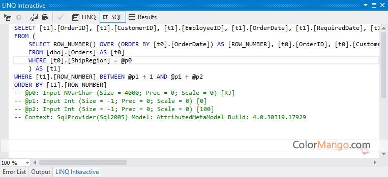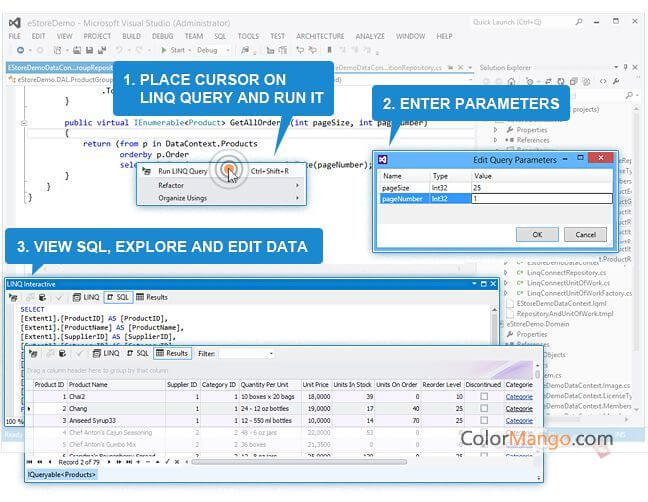 LINQ Insight is a Visual Studio add-in that enables you to run LINQ queries in Visual Studio at design time without initiating a debug session. Instead, it can test queries right after they're written. LINQ Insight also comes with a strong ORM Profiler tool for profiling your projects' data access layer and tracking all ORM calls and database queries.
