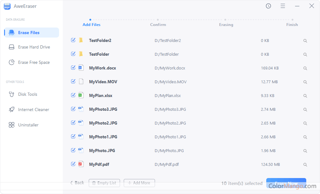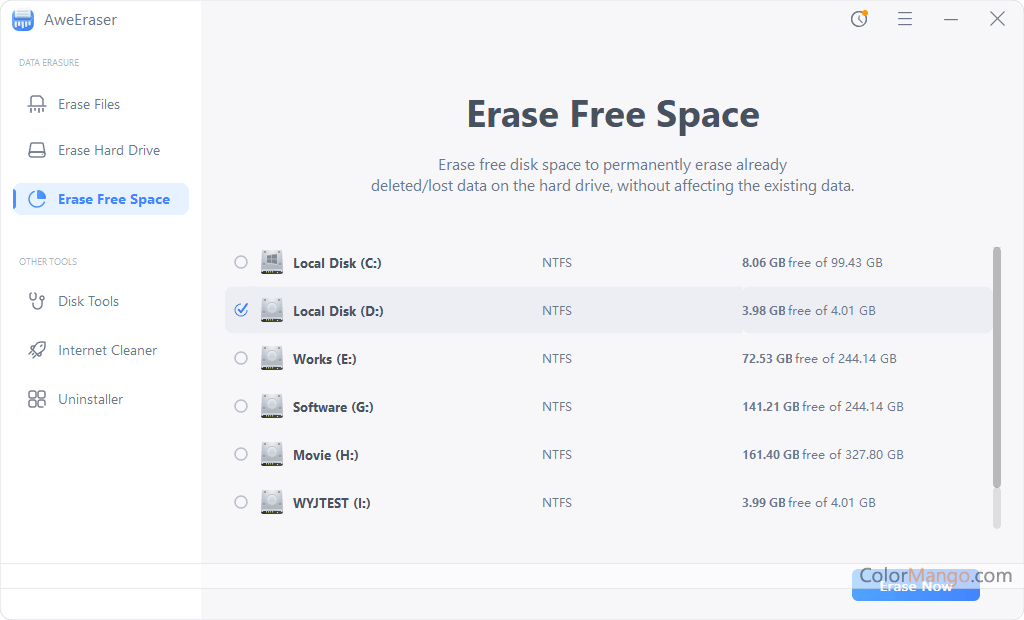Magoshare AweEraser is a powerful file shredder and disk wiper. It supports securely and permanently erasing data from a PC, laptop, HDD/SSD, USB flash drive, memory card, digital camera, etc. It provides safe and certified data erasure standards like U.S. Army AR380-19, HMG Infosec Standard 5, DOD 5220.22-M, German FOFIS, and Peter Gutmann's algorithm. The Full Erasure Report enables you to check what data or hard drive you’ve erased. More great features like Powerful Uninstaller and Secure Privacy Cleaner are also included.