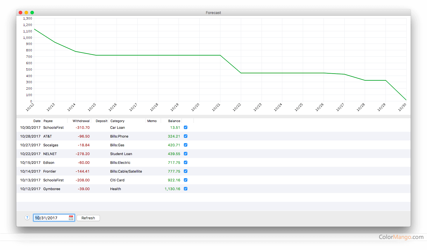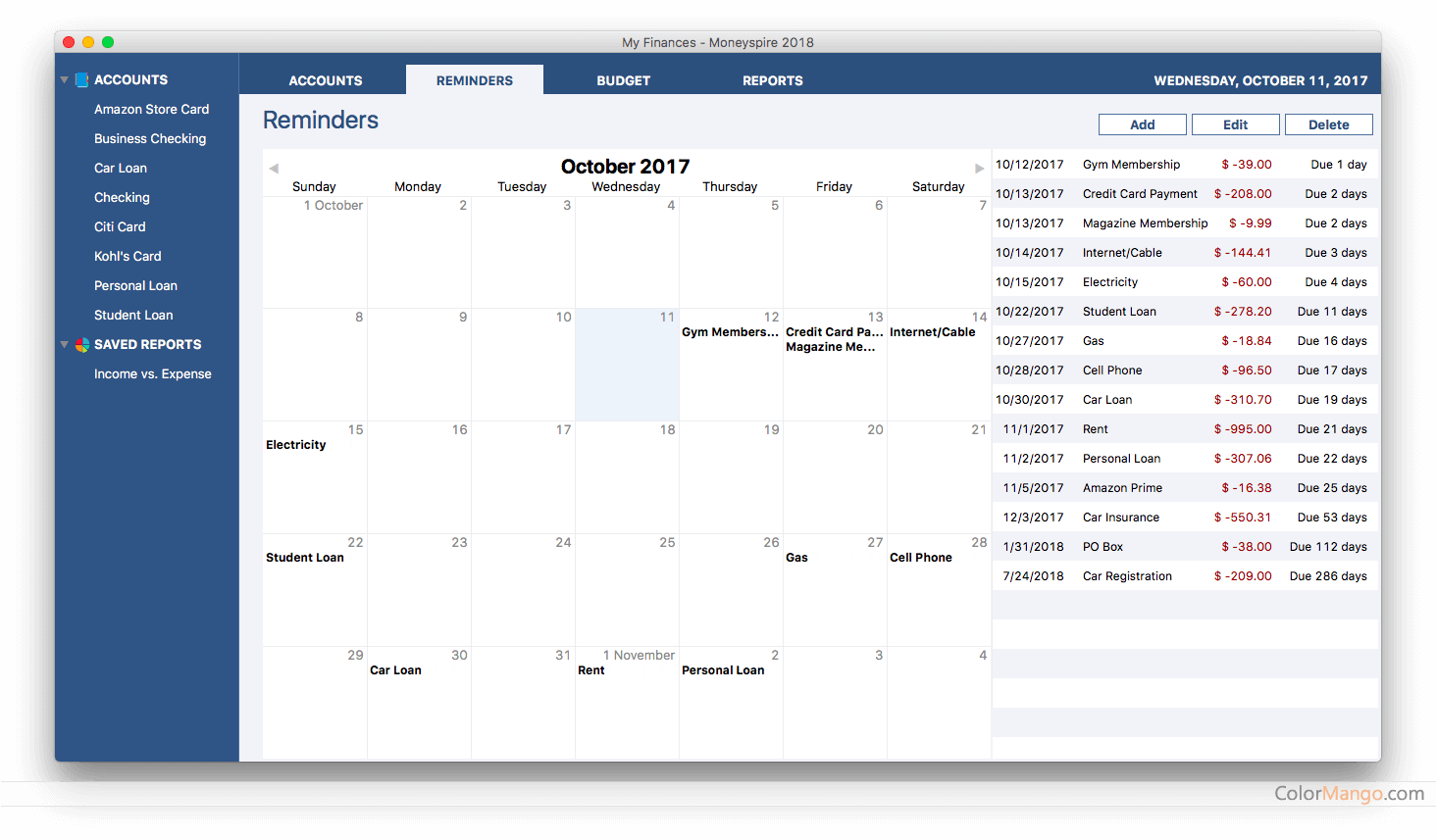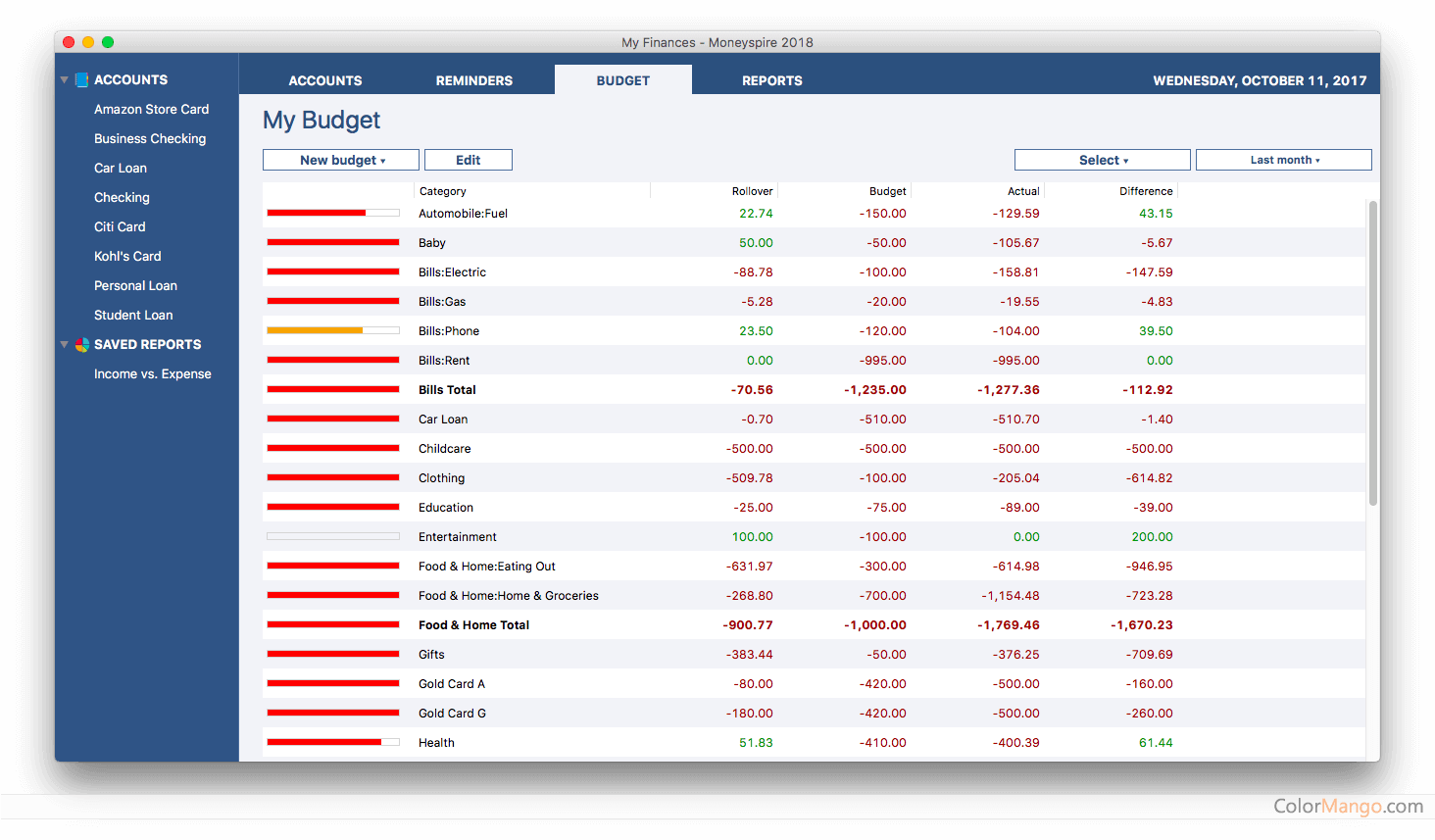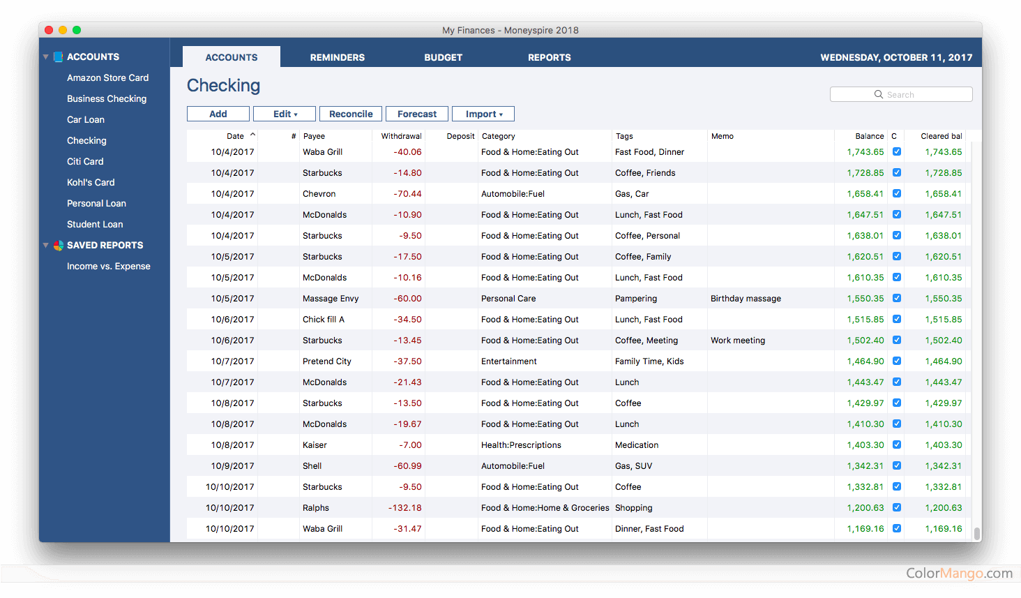 Moneyspire features 1. Track your bank account, credit card, etc., organize your transactions, and see where your money goes. 2. Set up bill reminders and see all your upcoming payments 3. Budget all your expenses and track your progress to help you stick to your budget. 4. Generate detailed reports and charts to see where your money is going.
