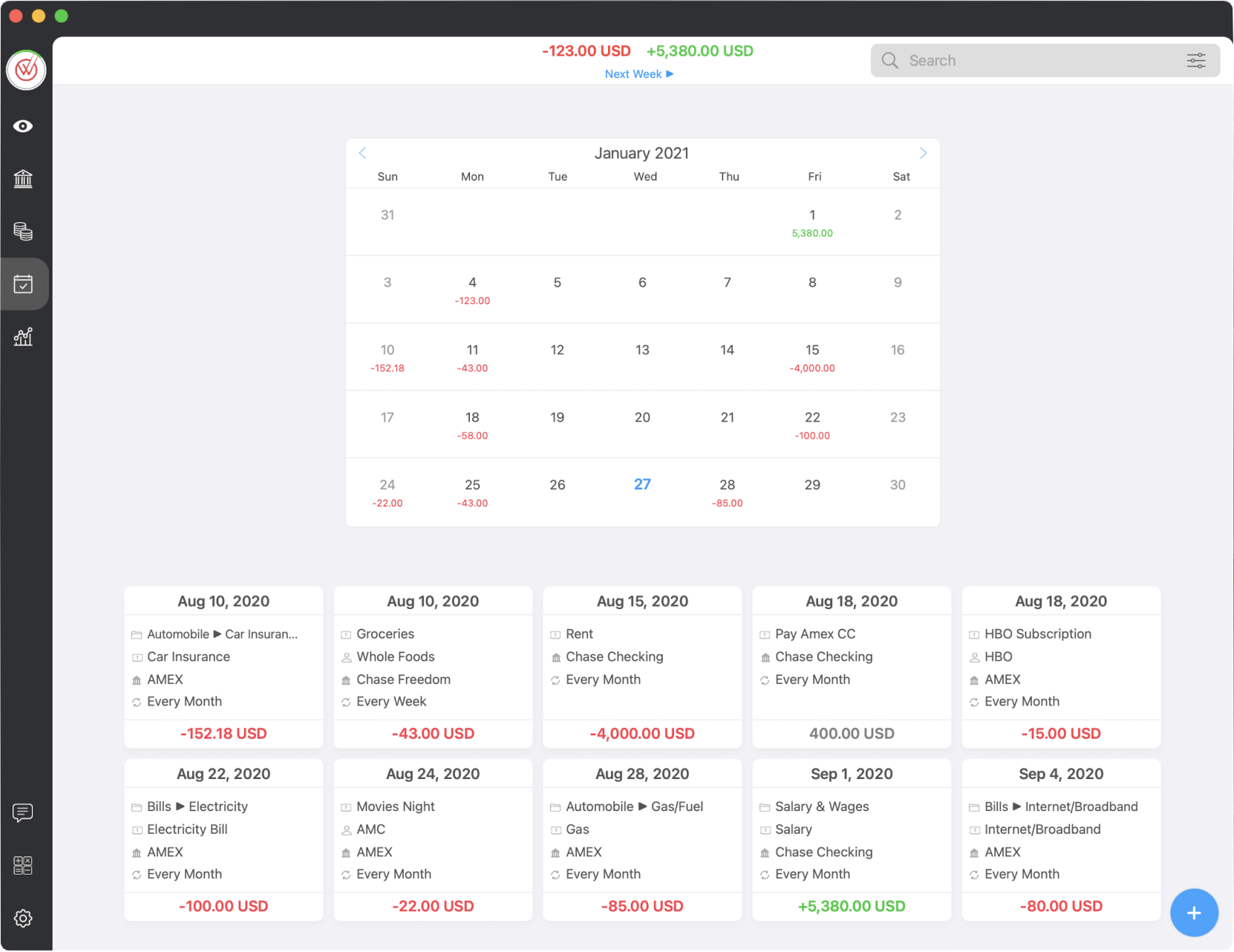 Create a regular transaction plan to make the budget easier Add a daily, weekly, monthly, annual, or other periodic revenue and expenditure plan, and MoneyWiz can keep accounts for you on time, eliminating a lot of repetitive recording work.
