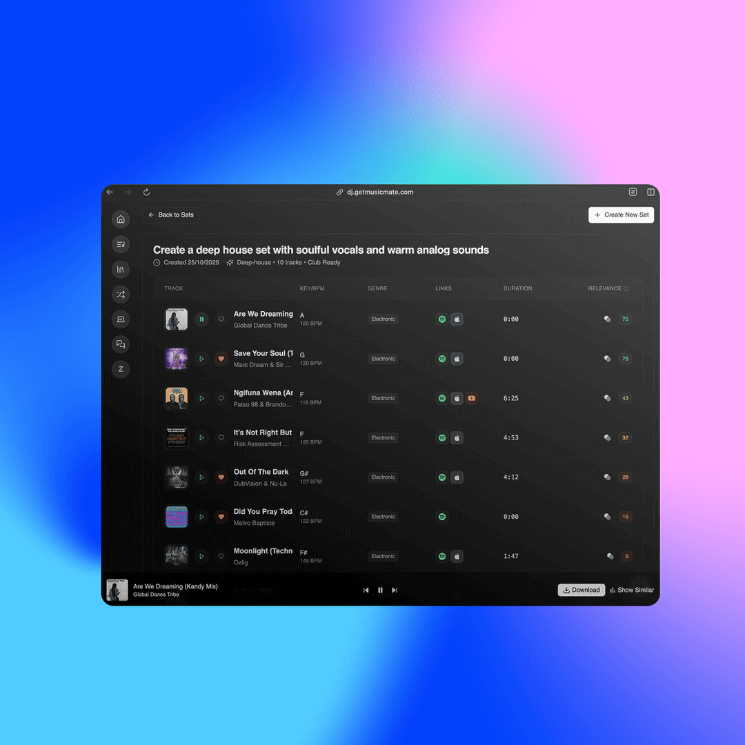 MusicMate is an AI-powered tool that helps DJs discover tracks and plan DJ sets by integrating music data from platforms like Beatport, Bandcamp and SoundCloud.