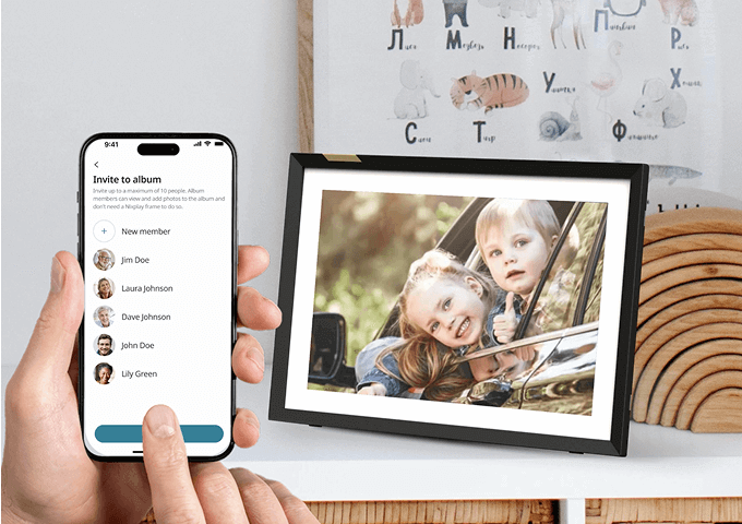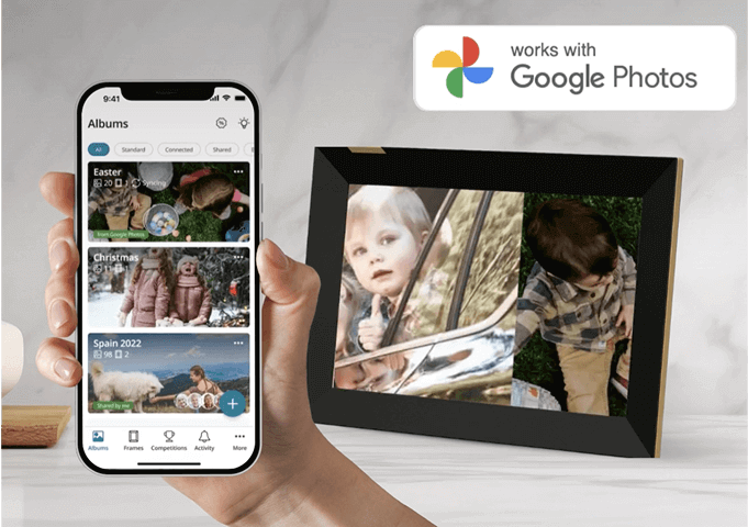 Smart digital frame that auto-frames faces, syncs albums, and tells your photo story with AI. *AI face auto-centering: always reposition subjects optimally in the frame. *Auto-rotate images based on orientation (portrait / landscape). *Syncs with Google Photos, Dropbox, shared albums, email upload. *Content preloading & gifting: preload photos/messages before delivery. *Event albums & live photo sharing during events. *Cloud & subscription features (video sharing, storage upgrades). *Secure, GDPR / CCPA-compliant cloud storage.Customer Q&A