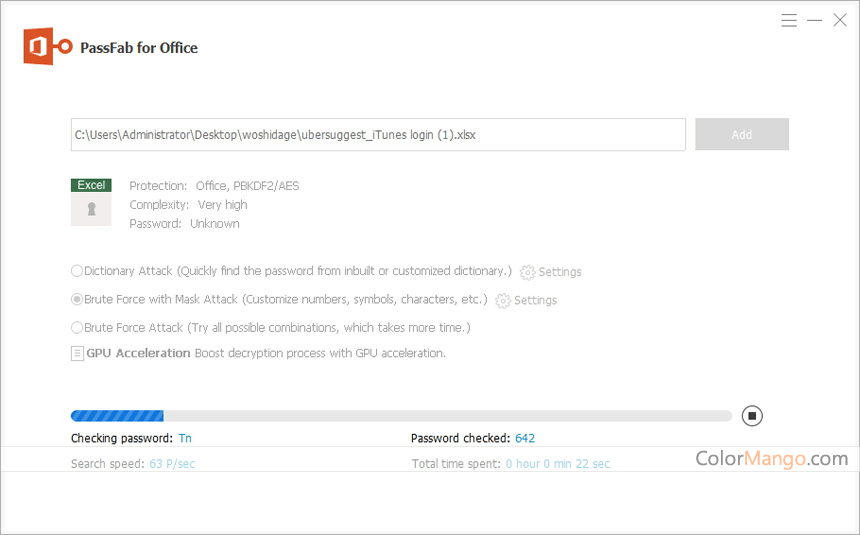 The process is straightforward. You just need to choose the encrypted Word, Excel, or PowerPoint document, select the recovery method, and the program would take care of the rest. Three attack modes are included in the recovery process: Dictionary Attack, Brute Force with Mask Attack, Brute Force Attack. It can recover the password of several document formats, including *.xls, *.xlsx, *.doc, *.docx, *.ppt, *.pptx. without causing data loss.