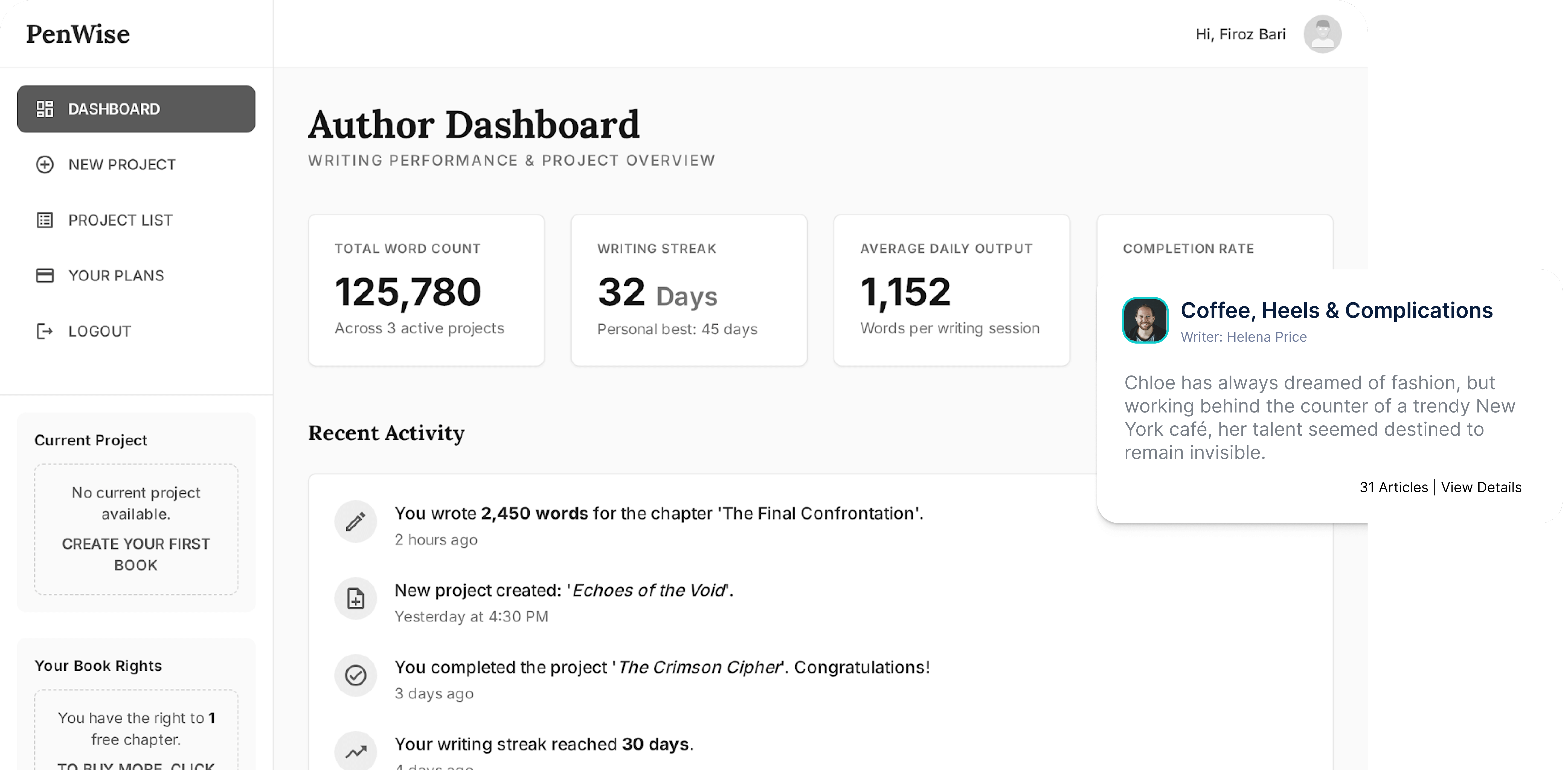 AI writing assistant that helps generate ideas, outlines, and chapter drafts, and provides real-time tone/grammar/vocabulary improvements, rephrasing, and suggestions to improve pacing, clarity, and emotional depth.