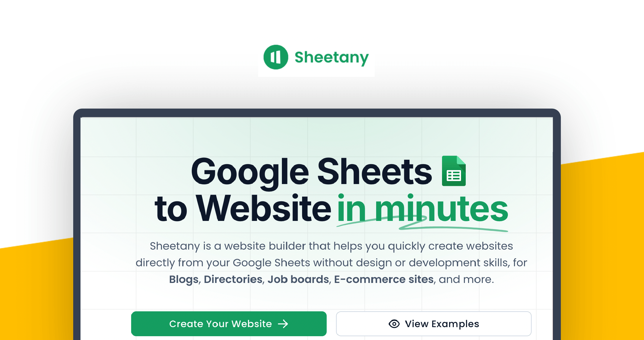 No-code website builder that allows you to create fully functional websites directly from Google Sheets Sheetany is perfect for anyone who wants to turn structured data into a website. You can build: 📝 Blogs 📇 Directories 💼 Job Boards 🛒 E-commerce Sites 🔗 Affiliate Hubs 📚 Resource Libraries … and moreCustomer Q&A