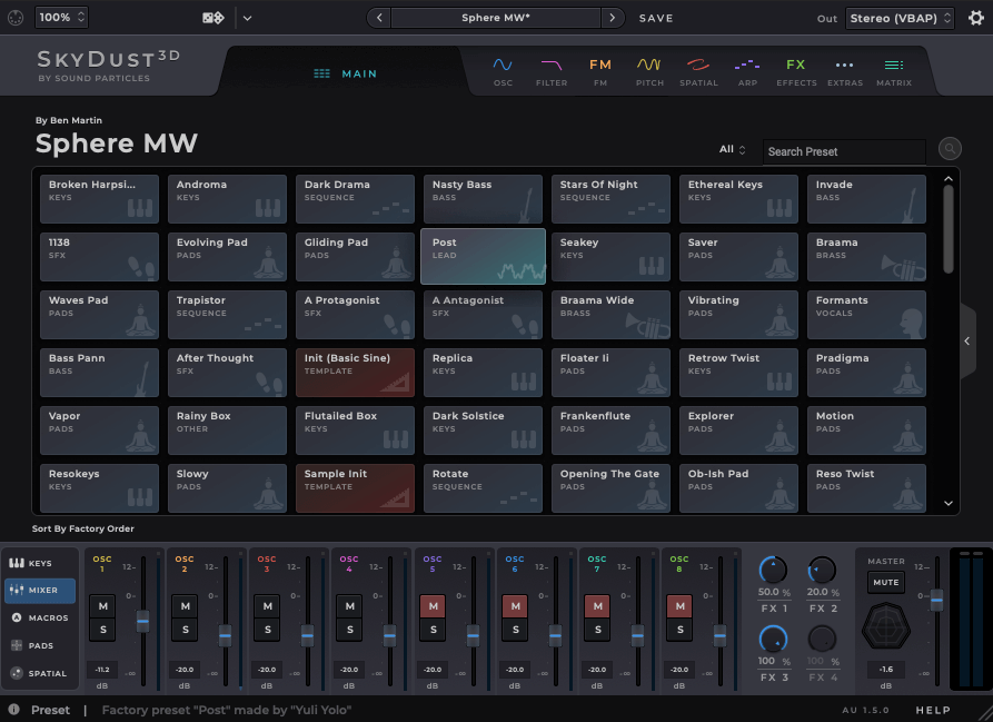 SkyDust 3D by Sound Particles is a 3D synthesizer that allows sound designers and musicians to create immersive 3D audio. It supports spatial audio formats, including Dolby Atmos and Ambisonics, enabling users to position and move sound in a three-dimensional space. SkyDust is designed for use in both music production and film sound design, offering advanced control over sound placement for heightened auditory experiences.