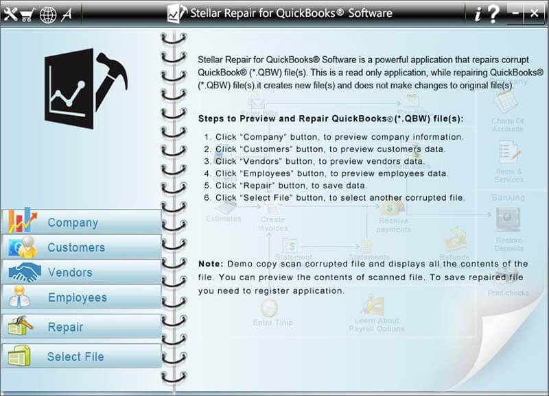 Stellar Repair for QuickBooks Features: + Restores all items of the company, customers, suppliers, and employees + Restores salary checks, payroll transactions, job details, etc. + Provides a preview of all recoverable data in the corrupted QBW file + To recover QuickBooks data from a QuickBooks backup (QBB) file + Works with QuickBooks Pro, Premier, and Enterprise + Fixs QuickBooks files created in all QuickBooks versions from 2007 to 2019