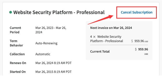 Click Cancel Subscription on the top right corner of the subscription you would like to remove the automatic renewal.
