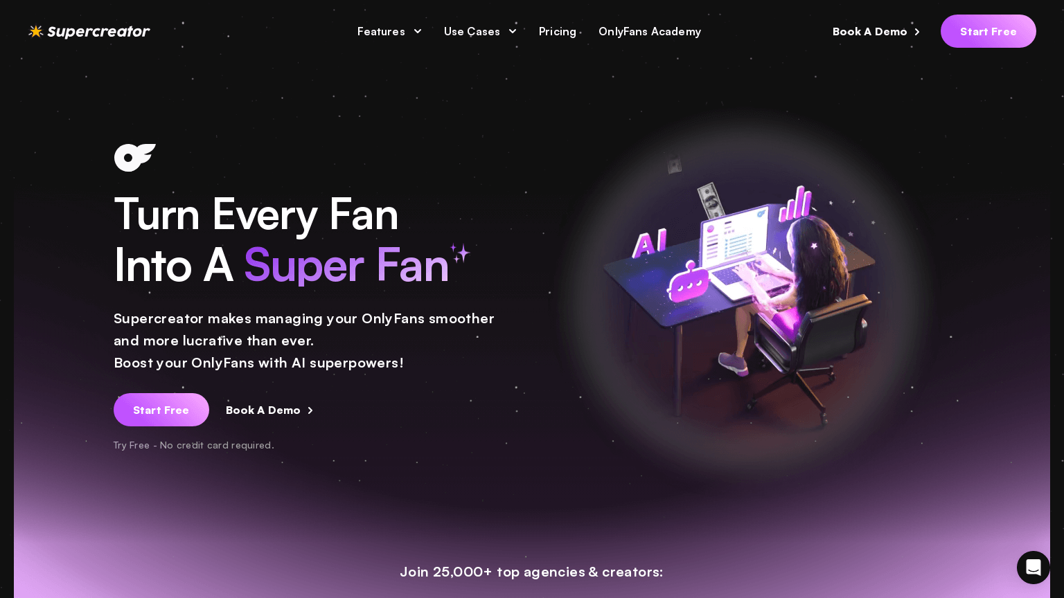 Why Choose Supercreator? 🚀 Over 25,000 creators & agencies trust Supercreator 💰 Increases revenue by automating engagement & sales 🔐 Secure OnlyFans login without sharing credentials 📊 Data-driven insights for fan behavior & content performance 🤖 AI-powered chat automation to save time & maximize earnings