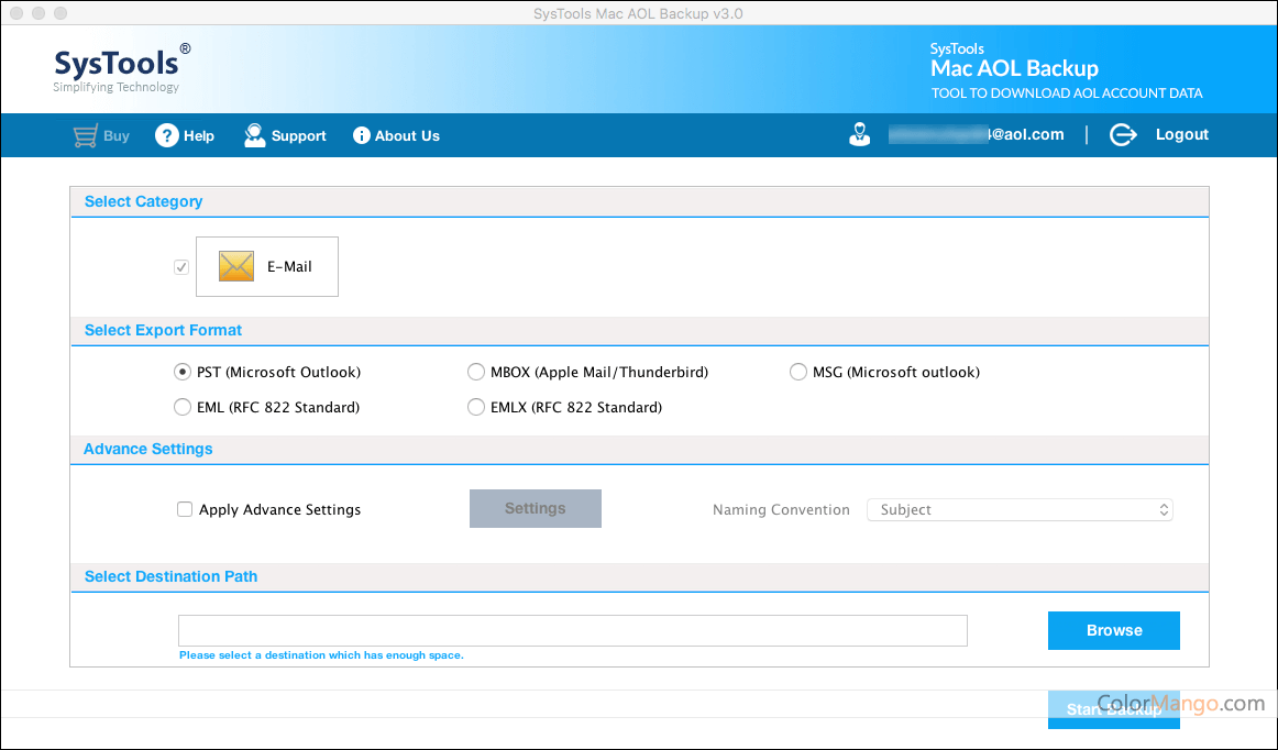 SysTools AOL Backup is easy to use and requires only a few simple steps to complete a quick backup of your AOL email data. The backup files can be exported to Outlook, Thunderbird, Windows Live Mail, etc. In addition, the PST format of AOL Backup does not require Outlook to be installed.