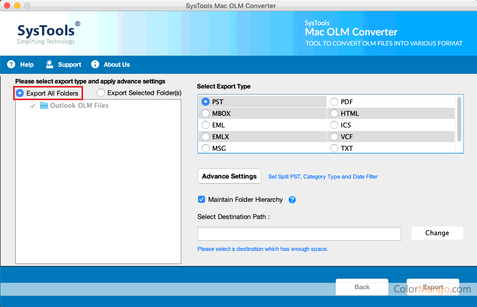 SysTools Mac OLM Converter Features Convert email, contact, calendar, task, attachments, & notes of OLM File Convert Mac OLM files in batch. Convert Mac Outlook emails to PDF file format with attachments Split the PST file into small parts Export data from OLM via date filter Supports Mac Outlook 2019, 2016 and 2011 Export group contacts Merge multiple PDF and ICS file