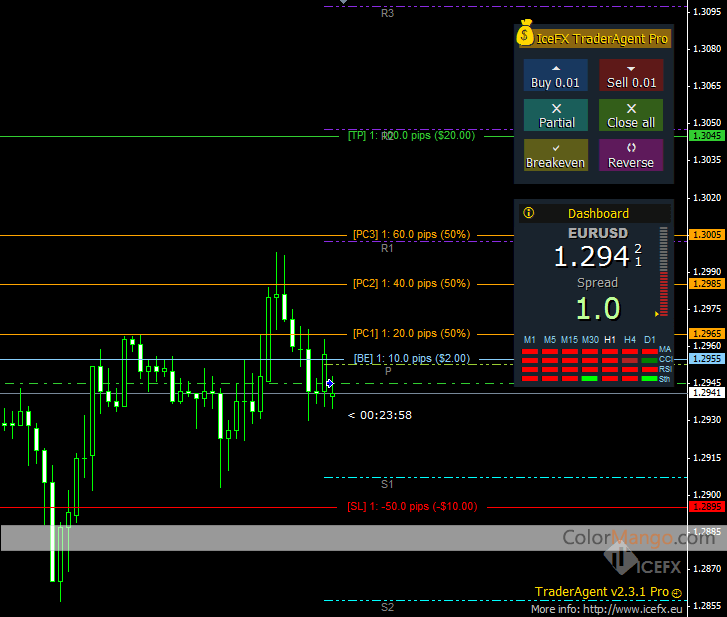 TraderAgent is the ultimate Trader’s assistant. All important information is displayed on the chart, so you only need to open the position, with just one click. Managing the opened position is just as easy as it could be: with your mouse or pointing device, you can easily adjust the stoploss and Take Profit levels with drag-and-drop method. After that TraderAgent will work for you as a position management solution. With it’s user-friendly graphical interface, anyone could quickly learn how to use TraderAgent successfully during daytrade.