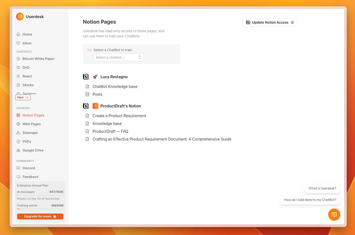 Train the chatbot on your documents (web pages, Notion, PDFs) for instant, relevant responses.