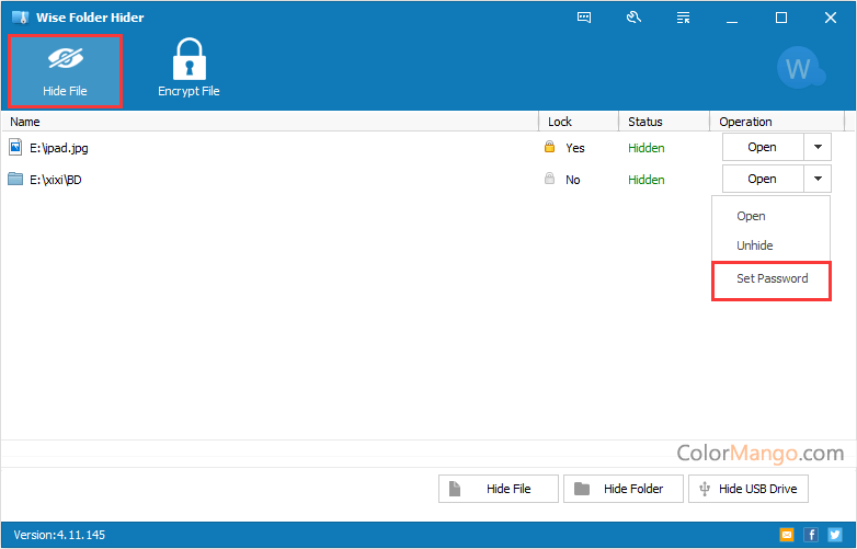 Wise Folder Hider Pro is an efficient folder hiding tool, which allows users to hide files and folders on local partitions or mobile devices, such as pictures, documents, videos, etc. When using it for the first time, you need to set the login password so that if other people want to log in to the software, they need a password to enter. Unlike other folder hiders, Wise Folder Hider Pro can hide personal files and folders on a USB flash drive with one key and protect them with a password. Even if the USB drive is lost, important files will not be stolen by others. When modifying hidden files or folders, users don't have to cancel hiding, edit and hide them again, convenient to operate.